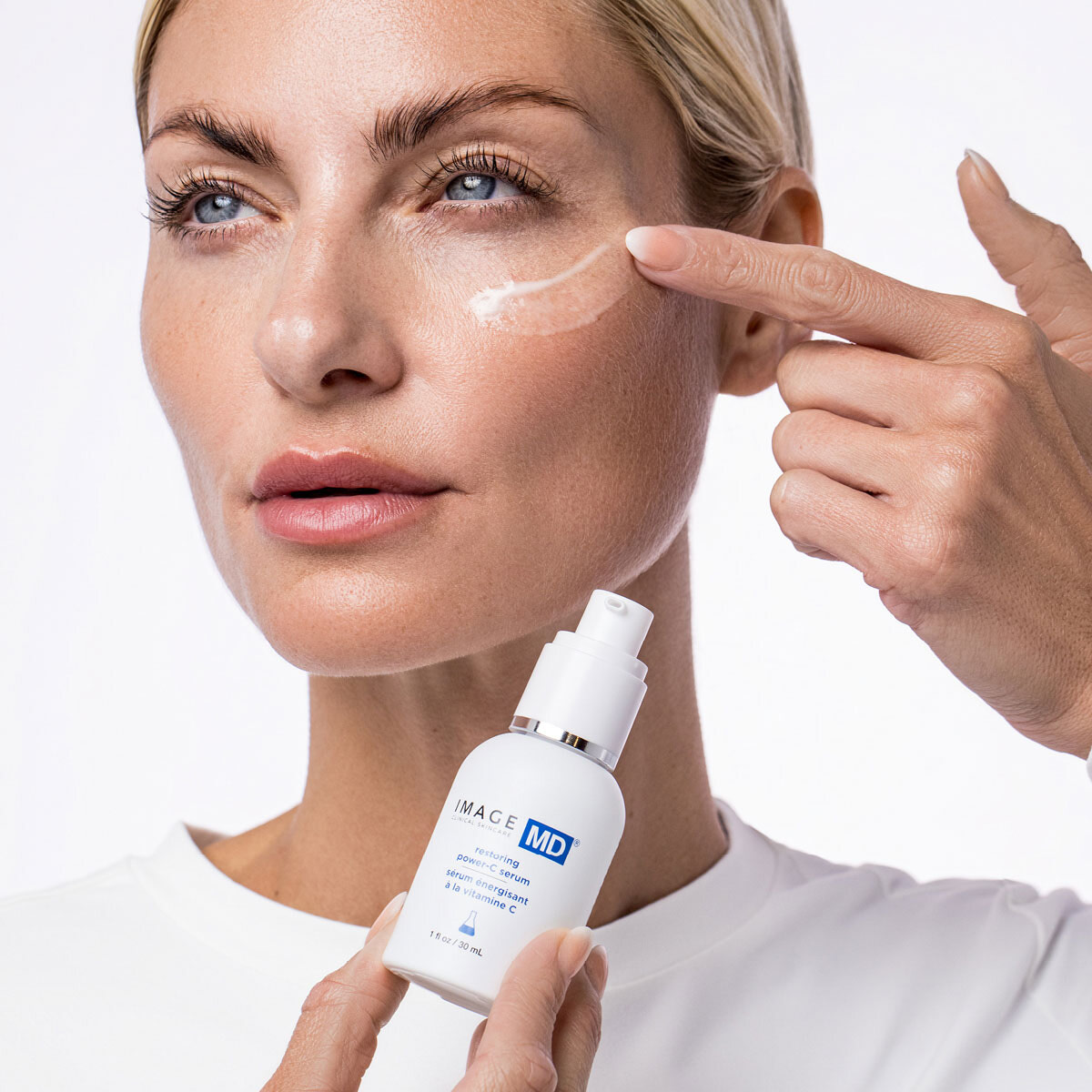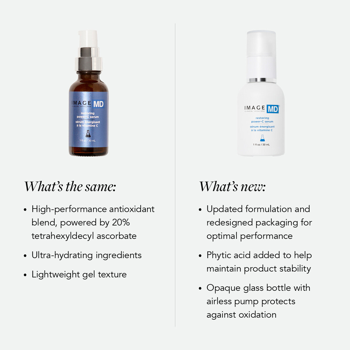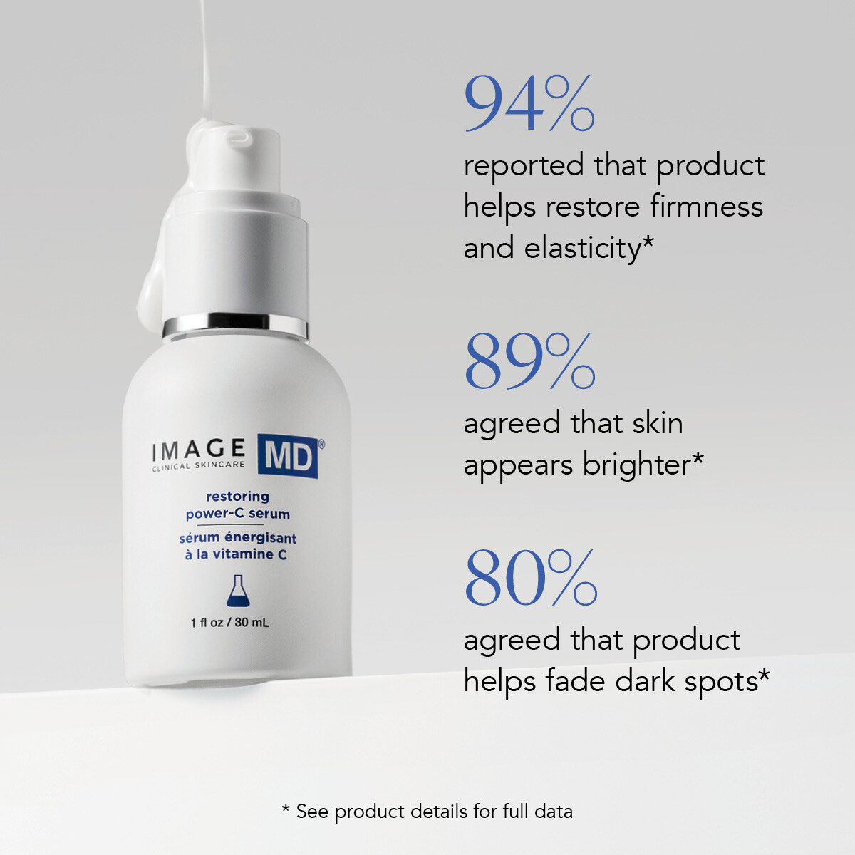IMAGE MD restoring power-C serum$99.00 /1ozOur most sophisticated serum yet: a high-performance vitamin C facial serum that’s clinically proven to improve wrinkles, pigmentation and firmness. Doctor developed, this daily defense serum helps to brighten, refine and restore firmness, smoothness and elasticity. With 20% tetrahexyldecyl ascorbate, a lipid-soluble form of vitamin C, it helps to fade the appearance of pigmentation and improves signs of skin aging like fine lines, wrinkles and loss of firmness. A synthesis of super-antioxidants ferulic acid and acetyl zingerone help to enhance the effects of vitamin C and defend against environmental damage. Hyaluronic acid brings renewed hydration to the skin, supporting a plump, smooth and firm appearance. The lightweight formula with hints of orange oil leaves skin with a power-packed radiant glow and soft, dewy finish. |