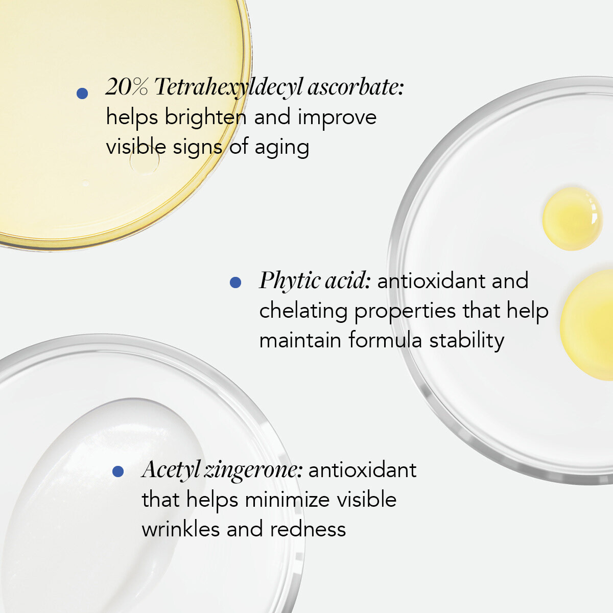 IngredientsAqua/water/eau, Tetrahexyldecyl Ascorbate, Pentylene Glycol, Ethoxydiglycol, Acetyl Zingerone, Glycerin, Tocopherol, Phenoxyethanol, Sclerotium Gum, Ferulic Acid, Polyglyceryl-6 Polyricinoleate, 1,2-hexanediol, Sodium Hyaluronate, Ethylhexylglycerin, Lactobacillus/Portulaca Oleracea Ferment Extract, Citrus Aurantium Dulcis (Orange) Peel Oil, Pelargonium Graveolens (Geranium) Flower Oil, Limonene, Citronellol, Geraniol, Linalool, Leuconostoc/Radish Root Ferment Filtrate, Lactobacillus, Cocos Nucifera (Coconut) Fruit Extract. |